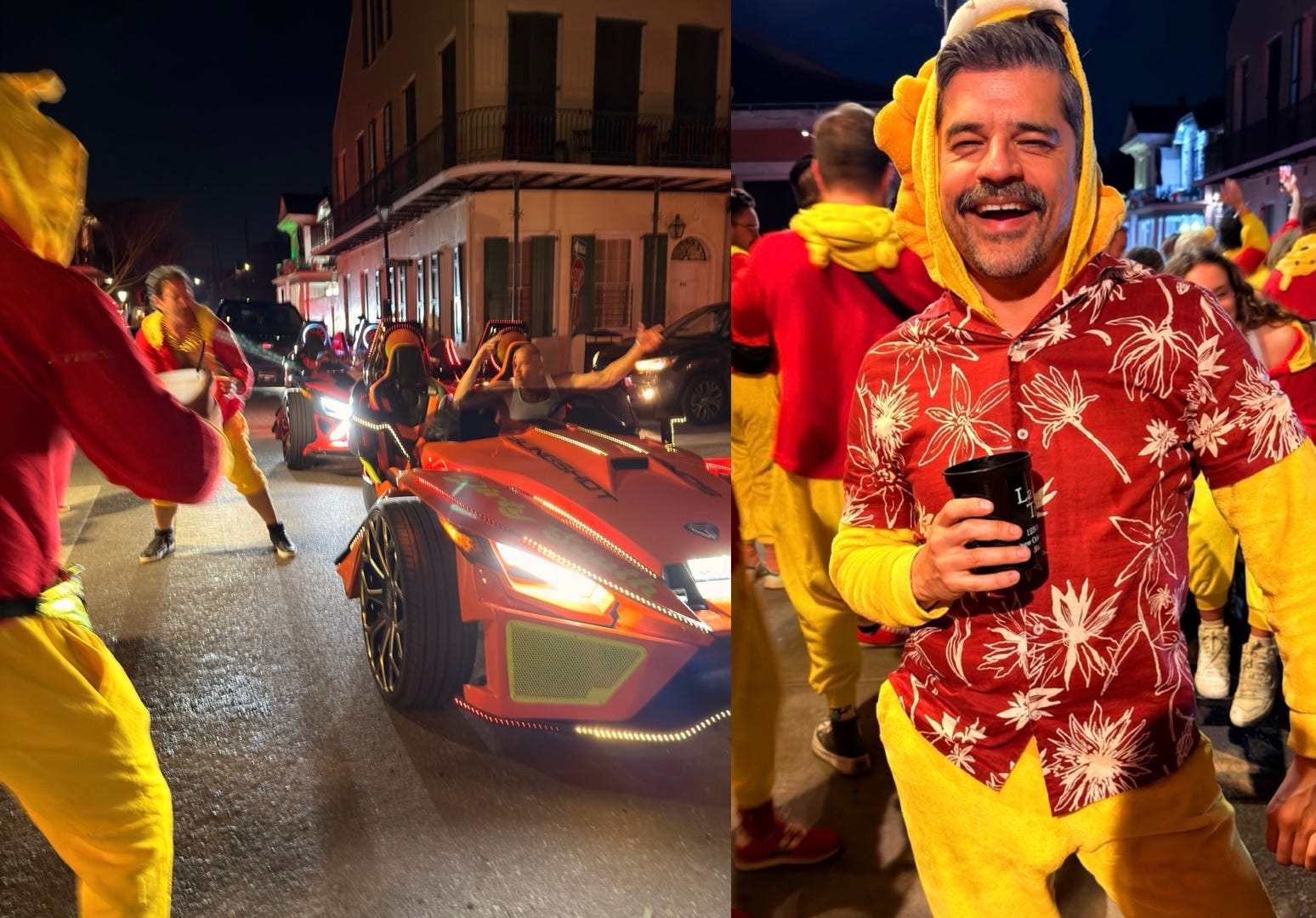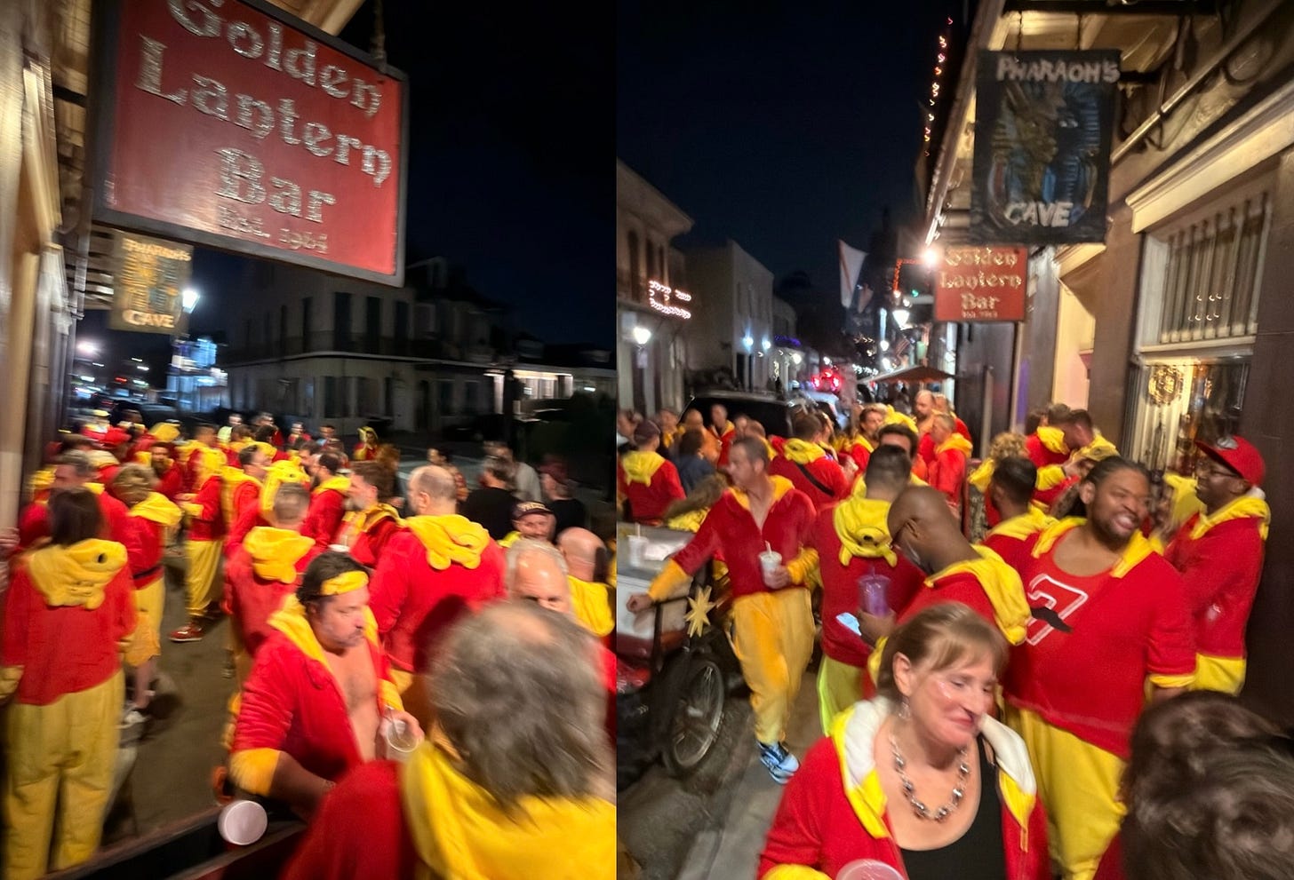 Last night, as I was getting home, an army of Winnie-the-Poohs gathered on my street for a friend’s birthday. They invited me on the party train but I didn’t have a Pooh look. I ran into my house, raided my costume closet (everyone in New Orleans has one) and improvised with a lion jumpsuit I wore for Mardi Gras years ago and a Hawaiian shirt.
