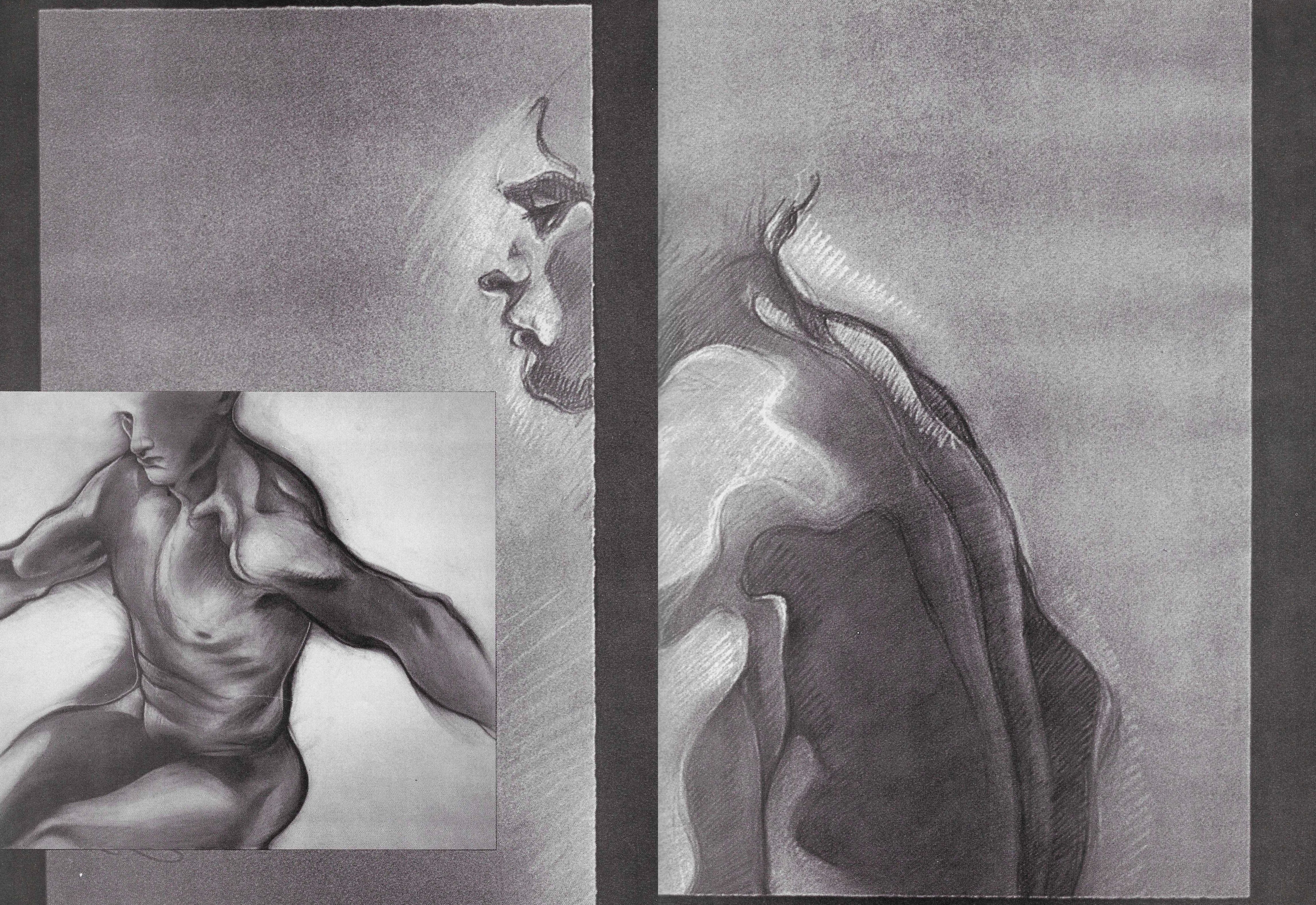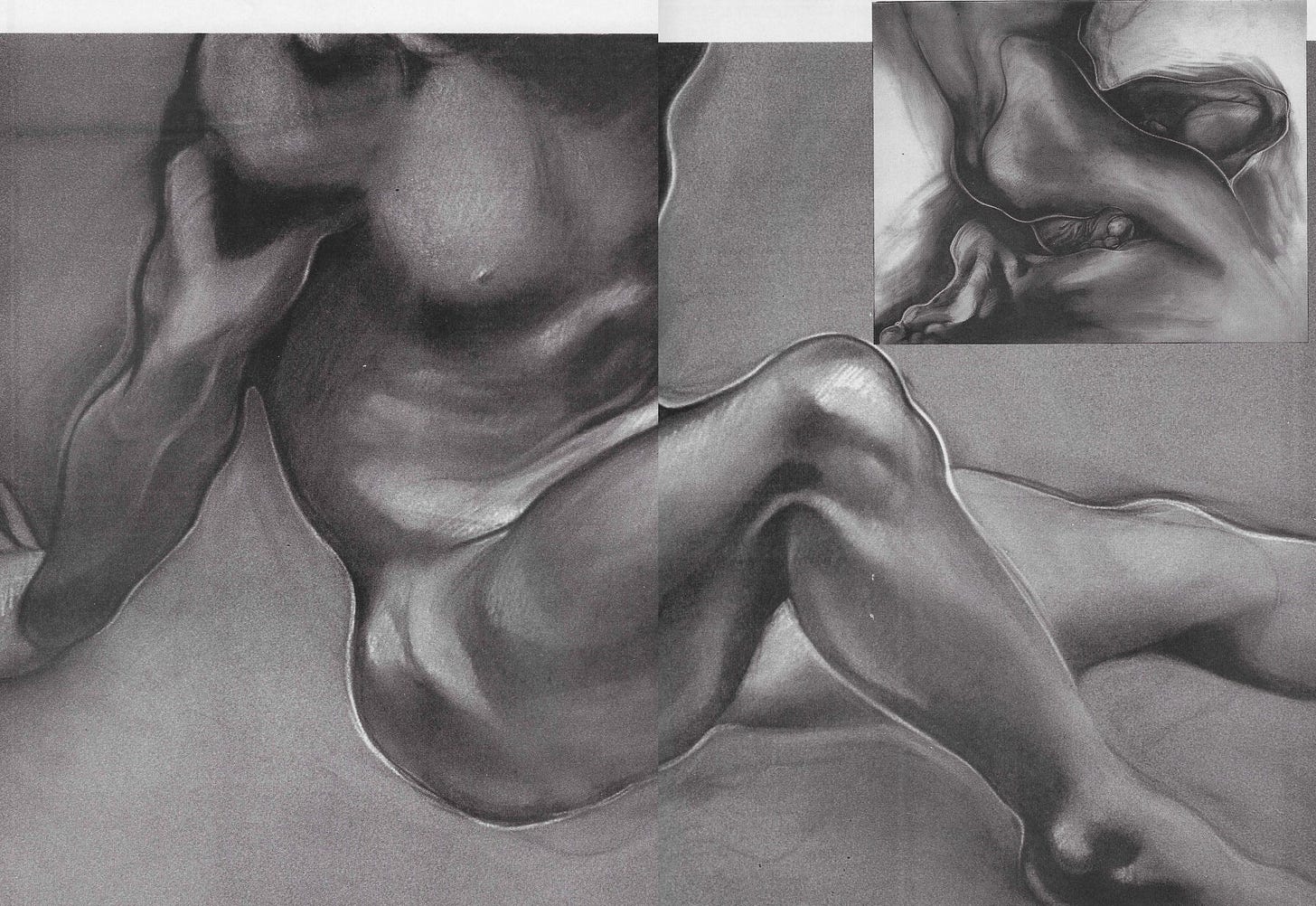 “I admire the control, the draftsmanship involved in portraying the classic nude. Working in earth colored conte crayon to capture the quality of an old master’s sketch, but in a scale life-size or larger, creates a contemporary image. I want the male nude to be a subject in art as acceptable as the female nude or landscape.”
